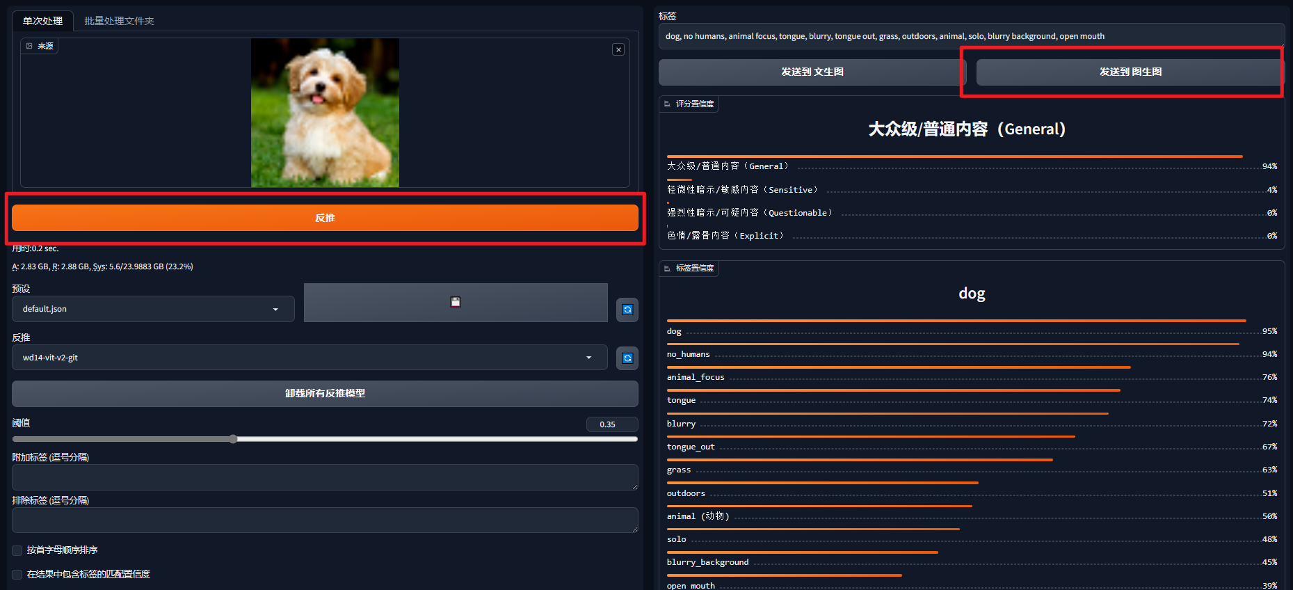 这里选择一张精度非常低的小狗图反推提示词到图生图