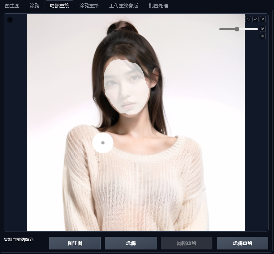 图生图中上传我们的参考图,选择局部重绘,把脸涂上(保证脸部不变):